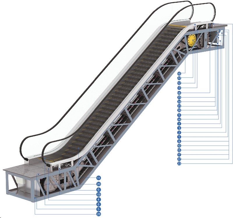 The pallet directly connecting with the chain makes the running more smoothly and quietly, thus the service life is extended and its maintenance can be easily conducted. Special designed big wheel handrail drive runs in low noise and big power, which improves the running condition of handrail . Its life is hence prolonged. Unique tube structure has a big load capacity, which greatly improves the overall stability and service life.